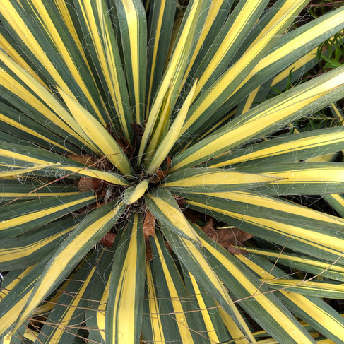 Spacing the plant out a bit softens its spikiness. You still get the foliage contrast but it is not overwhelming as it can be when planted in even small drifts. Along this walkway, adam's needle is planted about every 12 feet or so. It draws your eye forward.