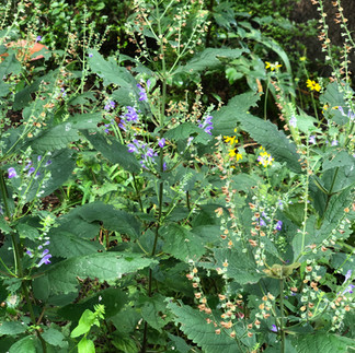 When I asked how she got started, Karen said she asked Baywise, a program of the University of Maryland's Extension Service to evaluate her yard. Their assessment found many more native plants were needed to try to get to the goal of 70% natives recommended by Dr. Tallamy for maximizing the ecological benefit of a garden. "I read another great book by Nancy Lawson called The Humane Gardener and decided to make haste in changing our yard from a food desert (even though it was full of blooming ornamental plants) to a food source." Karen removed nandinas (Nandina domestica) and replaced them with low bush blueberries (Vaccinium angustifolium) and evergreen inkberries (Ilex glabra). "I expanded my existing beds and added perennials such as skull cap (Scutellaria incana), cardinal flower (Lobelia cardinalis), blue lobelia (Lobelia siphilitica) and bee balm (Monarda). I created beds in the sunny areas ... for coneflowers (Echinacea purpurea), goldenrod (Solidago speciosa) and asters (Aster). It was a labor of love because with every native plant addition came a host of wonderful wildlife – birds, butterflies and other pollinators. It’s such fun to see so much life in our yard!"