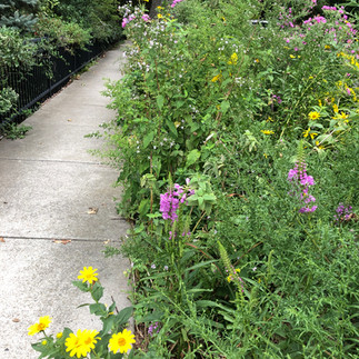 A couple of years in, one or two perennials (sunflowers and goldenrods) tried to take over the others. With some editing, they seemed to reach equilibrium. For the past two years, all I have done is cut back wayward stems that fall into the sidewalk or street. That is a must. Passersby definitely don't want to have to move plants to use public spaces.
