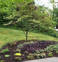 A good friend lives on a lively corner where the garden gets oodles of passersby, pets and kids playing. On top of that, a nearby oak tree shades the area and sends roots out along the ground surface. Despite the challenges, my friend planted a lovely corner bed featuring a native dogwood (Cornus Florida f. rubra) underplanted with a mix of natives and ornamentals. Dogwoods are understory trees so planting a younger dogwood beneath the canopy of a mature oak tree seems like a great choice. Two types of coral bells (Heuchera), blue fescue (Festuca glauca) and several ornamental hydrangeas (Hydrangea macrophylla) turn what could be a trodden corner into a neighborhood gem of a spot. The mix of textures, layering of natives with ornamental hydrangeas and selection of plants that do well in dappled shade make this a problem solved! It’s also a great example of how to blend favorite ornamentals with natives.